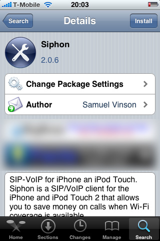 V Cydii vyhledejte aplikaci Siphon, pomocí které budete moci telefonovat přes WiFi nebo 3G (je nutné zapnout v nastavení) a nainstalujte jí tlačítkem Install.